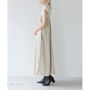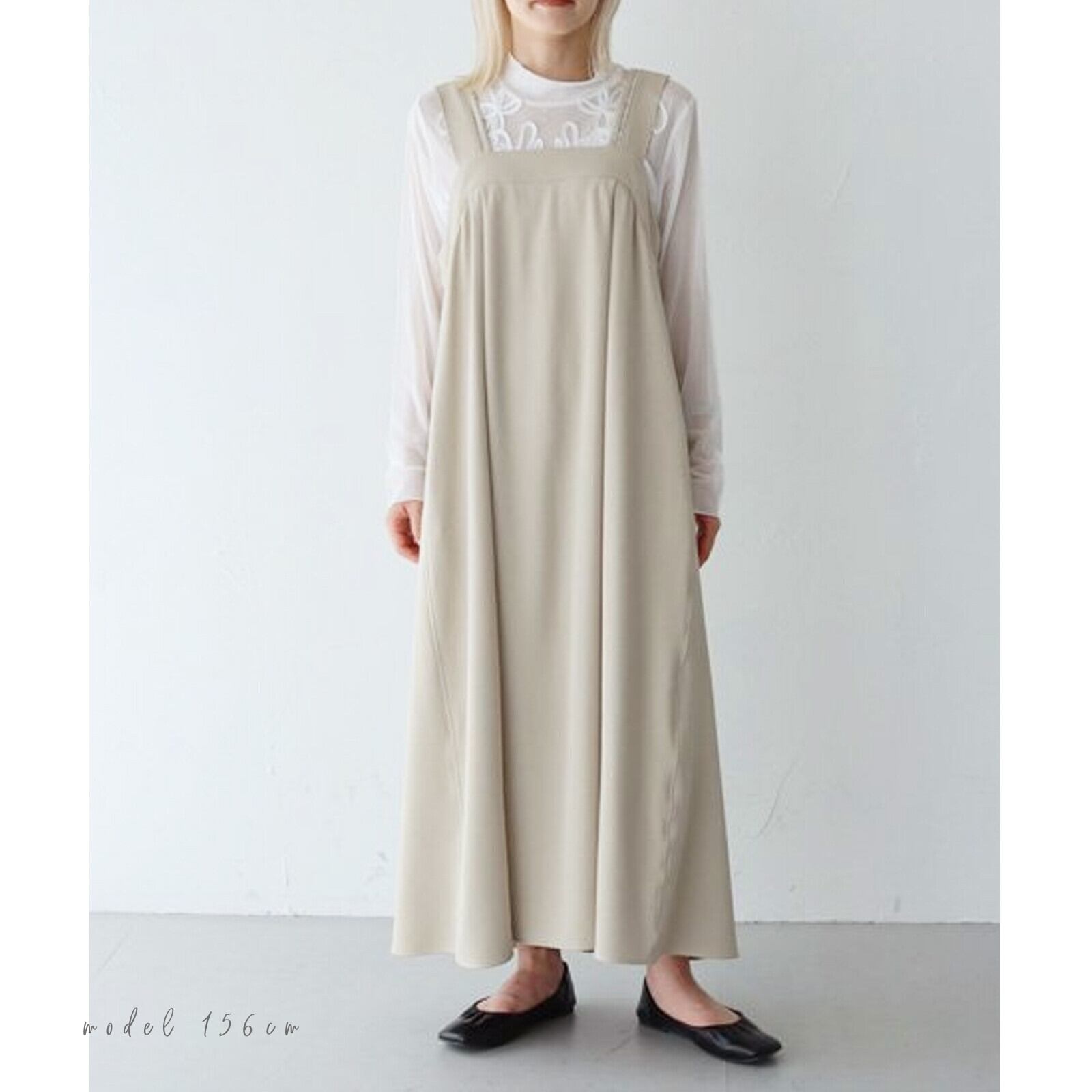 幅の異なる肩ベルトがポイントのジャンパースカート。後ろがカーブのゴムギャザーデザインになってるので、楽に着用いただけます。